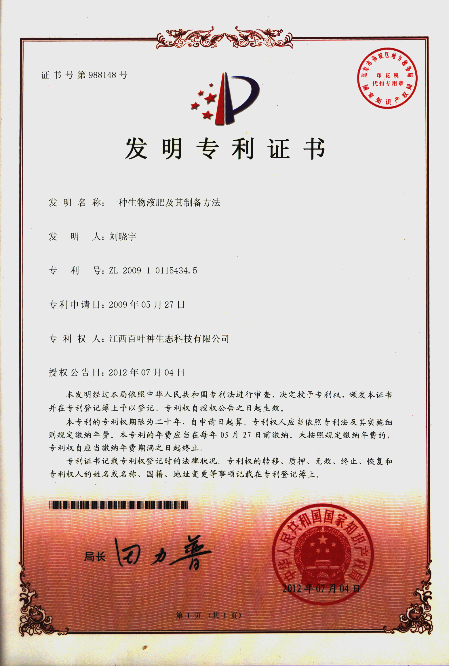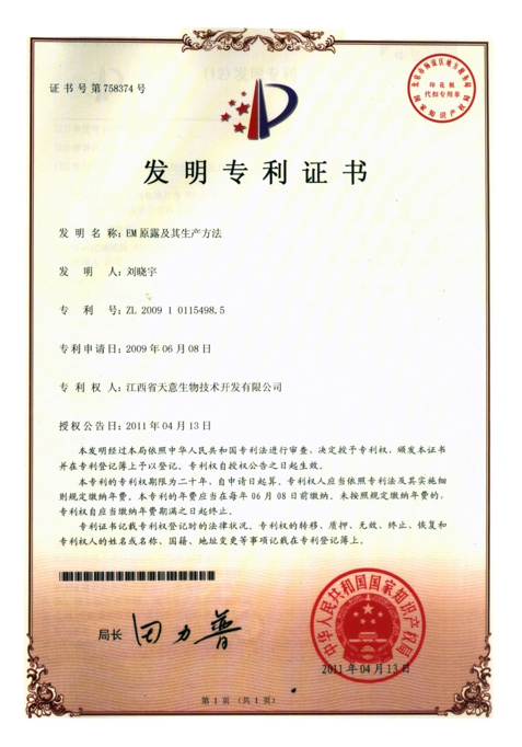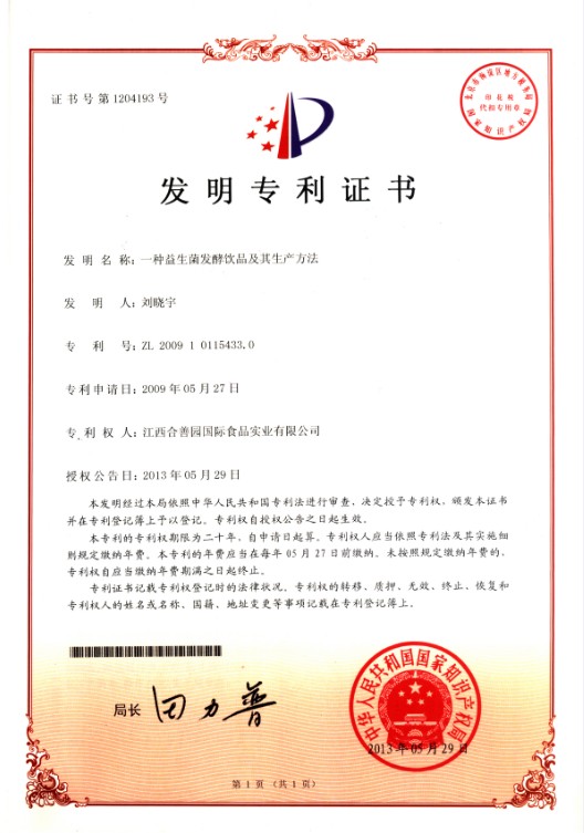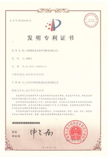 以植物胎盤(pán)為原料的酵素制備方法專(zhuān)利證書(shū)