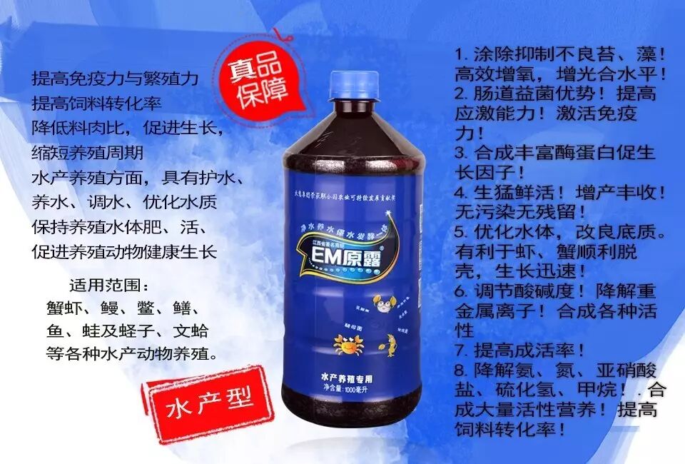 那年,魚臺的呂廣建向我推薦了江西天意生物的EM原露,我有點(diǎn)好奇于是買來試用。我共有四個池子,總面積15畝,其中一個700平米的池子用了EM原露,其他3個池沒有使用,試用池共放甲魚360只,每只均重600克,4個池塘用的飼料均為河北海泰牌全價甲魚配合飼料,同為5月26日放苗,試用池共用EM原露4瓶,前3瓶按照說明書加紅糖兌水發(fā)酵以后使用 ,最后一瓶直接兌水稀釋以后拌飼料。9月13日,甲魚出塘?xí)r只均重1500克,20%的甲魚超過了2000克,比其他池塘的均重增重500克左右,這也是歷年以來未有的好年景,不管是管理還是飼喂,只比往年和其他池塘多加了4瓶EM原露,每只成本只增加了幾毛錢,卻收到了意想不到的效果,這使我感到非常的意外。